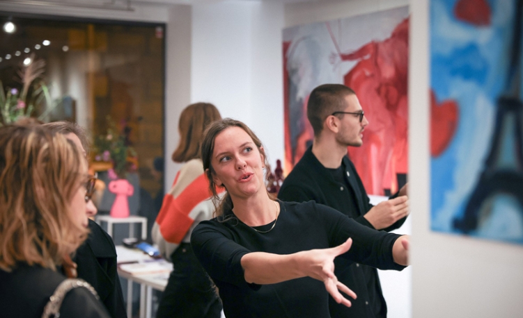 Au premier niveau de l’exposition, l’émotion pure explose en mouvements délicats sur les toiles de Sarah Knill Jones et Hadrien Loumaye ; deux peintresphysiques sur le fil de l’abstraction qui manifestent leur inspiration conceptuelle avec une gestuelle rapide et puissante, faisant tournoyer traits vifs et couleurs flamboyantes.